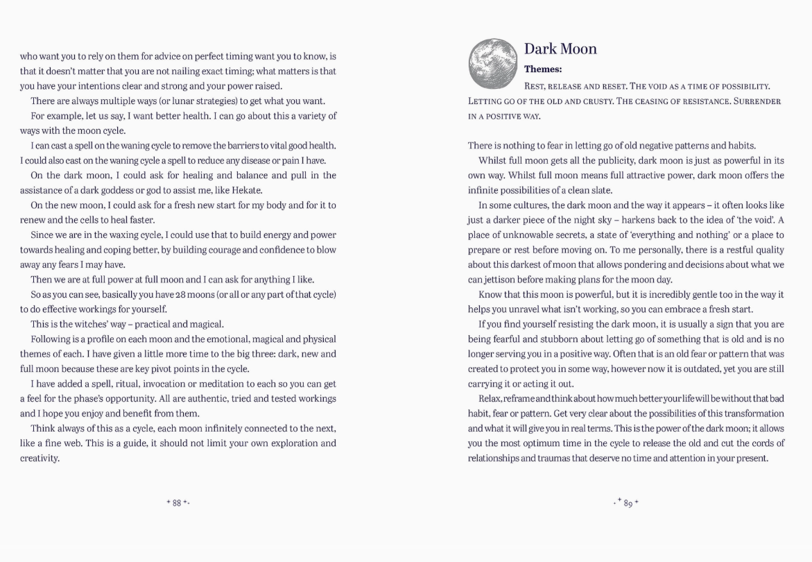 Also included are authentic meditations or spells for every one of the 28 phases of the moon, crystal suggestions for each moon phase, gardening by the moon guidelines and a handy 15-year chart of full, dark and new moons for easy reference.