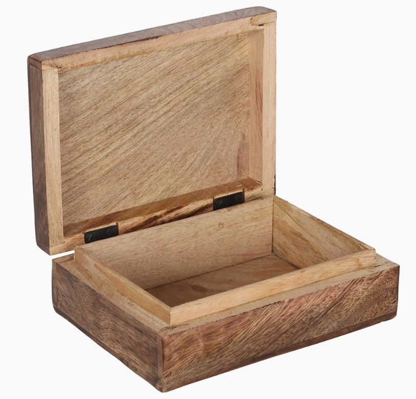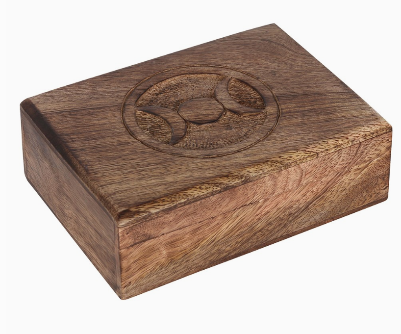 A hinged box made from mango wood featuring a hand carved triple moon design on the lid.