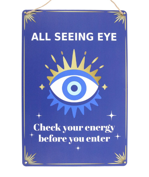 Add a dash of humor and a touch of charm to home and office surroundings with this metal Hanging Sign with a Rope Hanger, featuring illustrations of crystals, potion bottles and smudge sticks with the fun phrase, "Polite Notice, Please check your energy at the door. Smudge will be provided for bad attitudes".